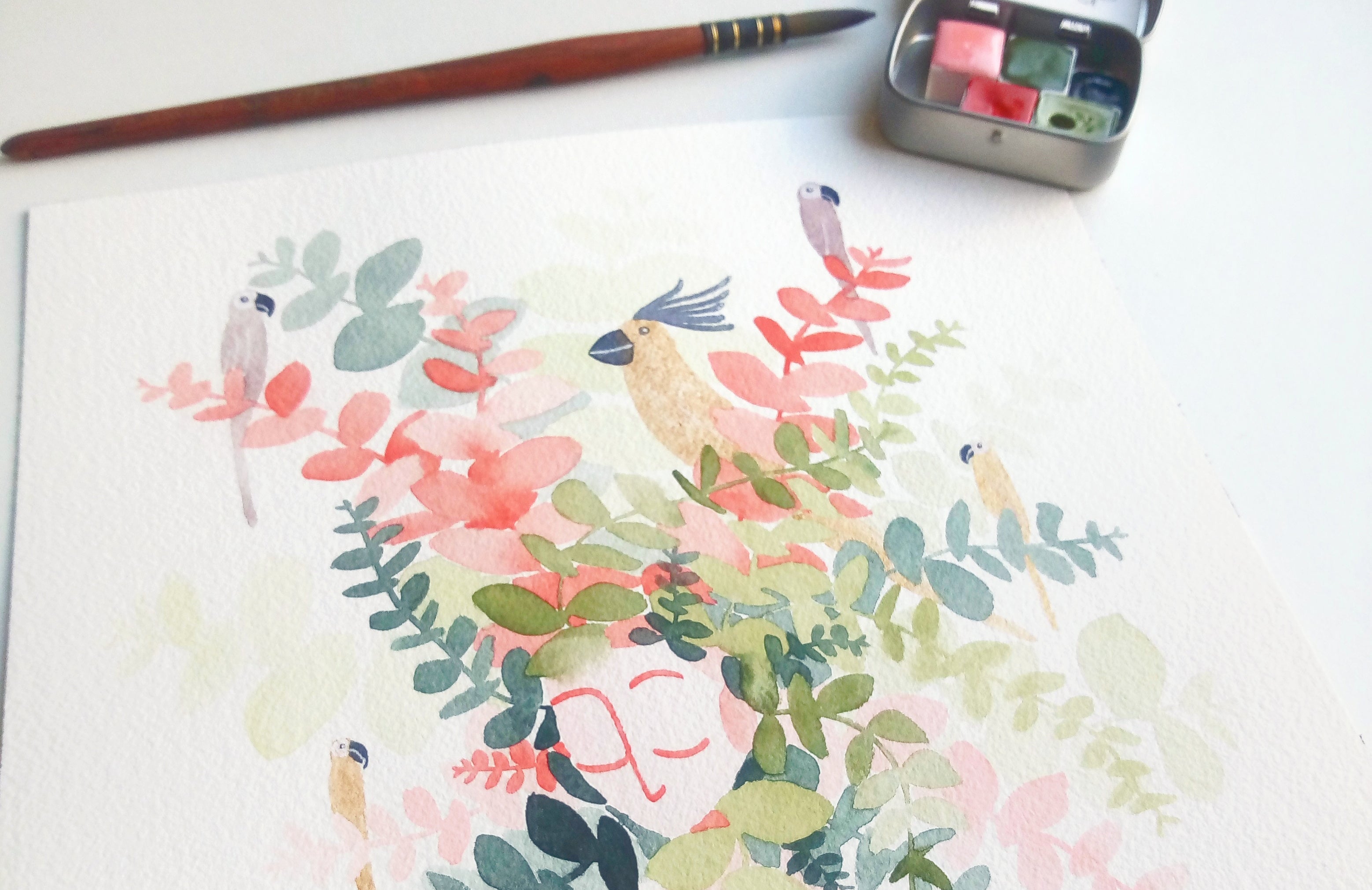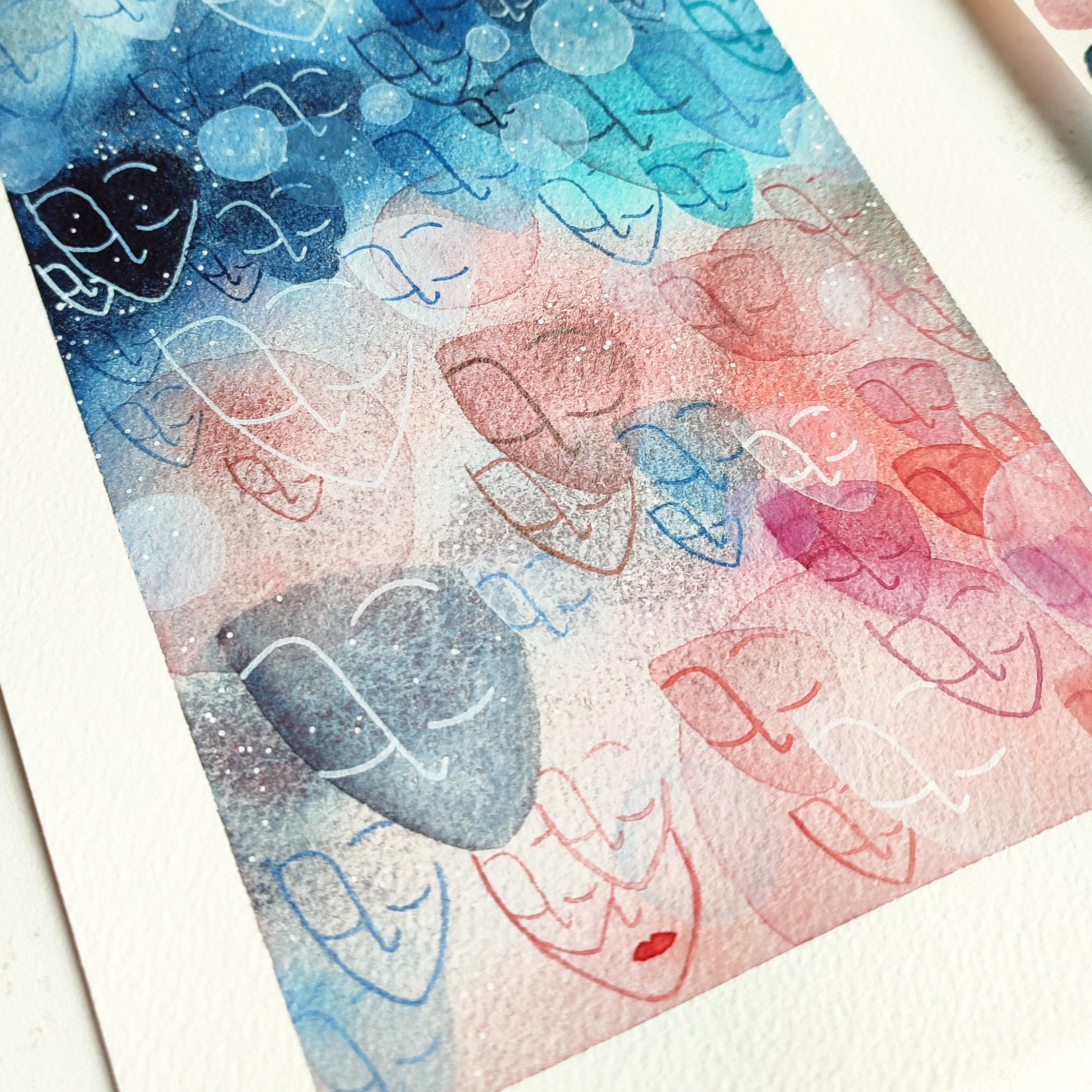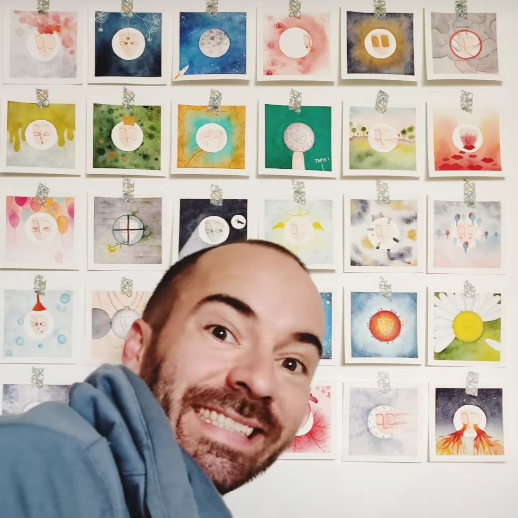 I discovered watercolor painting in 2020 during the confinement period. Painting every day, I gradually uncovered the limitless possibilities and delicate poetry that watercolor offers. It wasn’t long before I began painting small faces that became my signature series, âmes sensibles (sensitive souls).